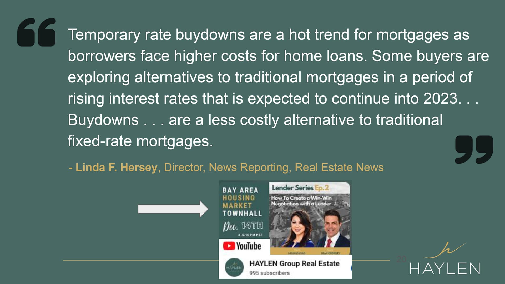 Linda Hersey, Director, News Reporting for Real Estate News, says, “temporary rate buydowns are a hot trend for mortgages as borrowers face high costs for home loans. Some buyers exploring alternatives to traditional mortgages in the period of rising interest rates that are expected to continue into 2023… Buydowns… are a less costly alternative to traditional fixed-rate mortgages.”