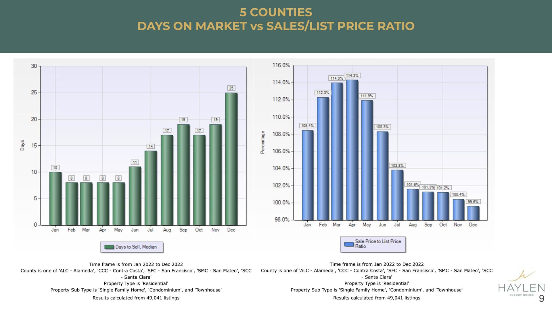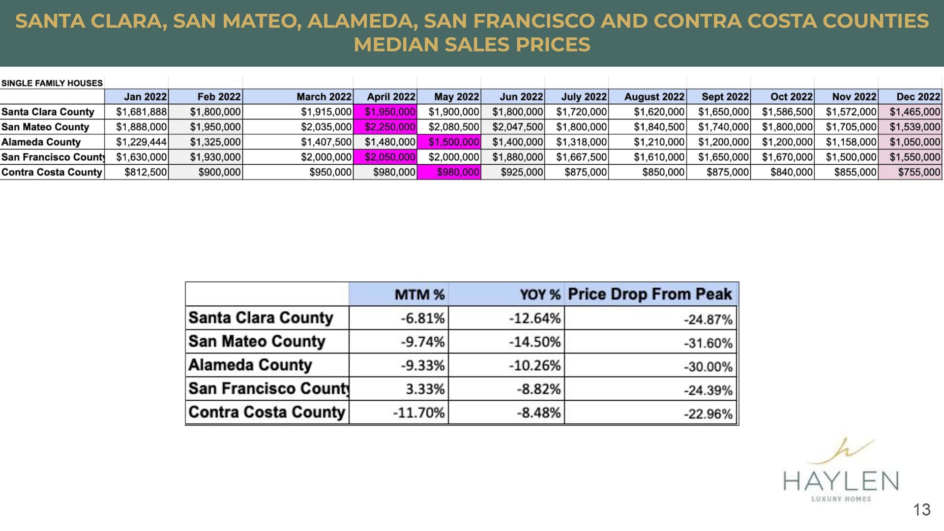 For Santa Clara County, it peaked in April at 1.95 and in December, the median sales price has gone down to 1.465. For San Mateo County, it peaked in April for 2.25 and it came down to 1.539. In Alameda County, they peaked in May for $1.5 million and in December, it went down to 1.05. Then, San Francisco County, it went up to 2.05 in April and came down to $1.55 million in December. For Contra Costa County, it peaked in May at 980,000 and also the pricing at December of 2022 had to come down to 755,000.
