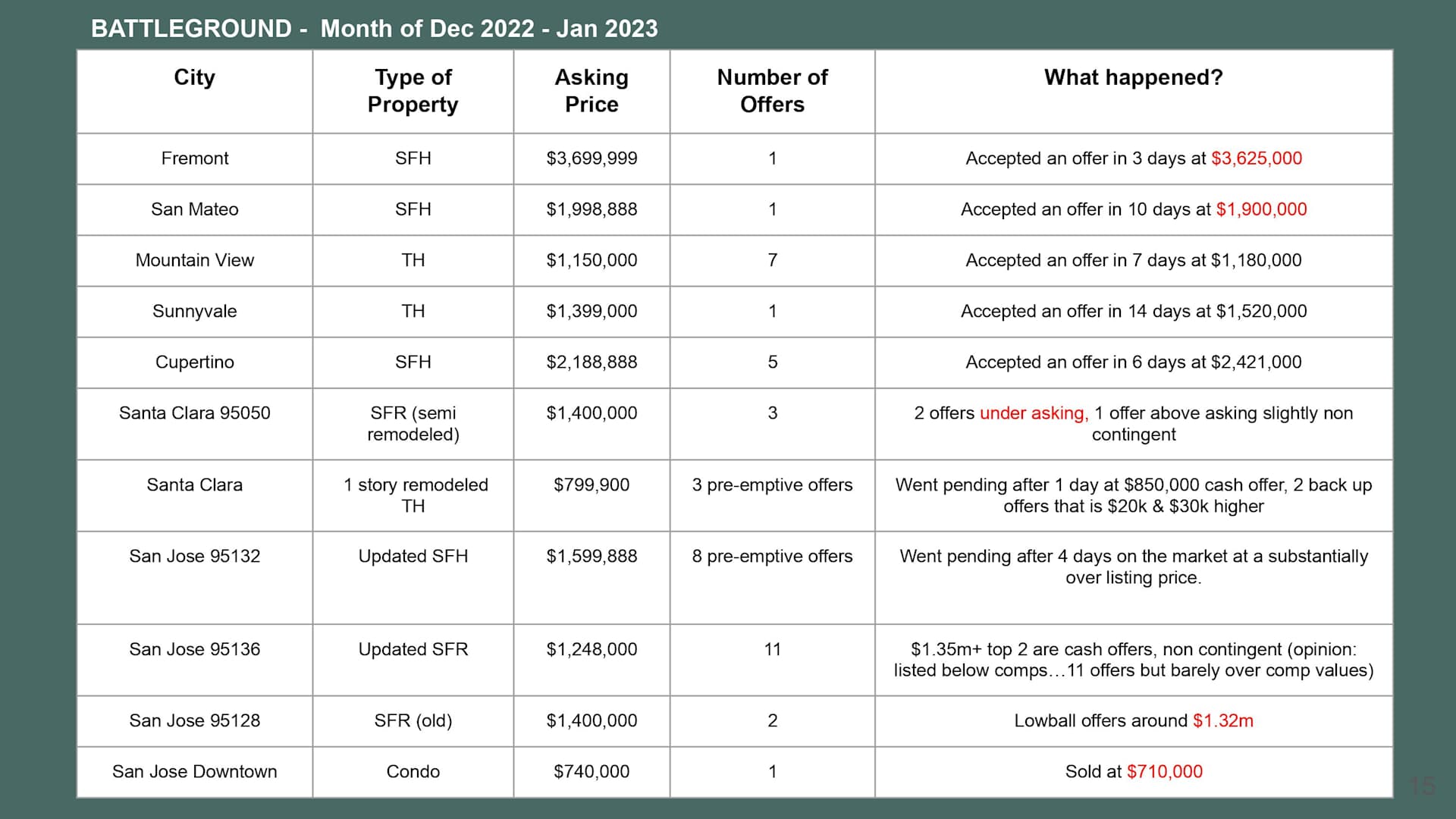 This is what has been going on, and there are a lot of properties that are not receiving any offers but then if the properties are in a really good location, it's like remodeled and it doesn't really have any defects per se. This means that it doesn't have, let's say, a weird floor plan and the location is not good because it is close to the noise and stuff like that, it typically is still getting quite a bit of interest. For example, in Mountain View, this townhouse is asking for 1.15. They did receive 7 offers and went up slightly above the asking price, but in Fremont and San Mateo, these single-family homes, it wasn't too bad. It was on the market still for a short period of time, but they only got one offer and slightly below their asking price.