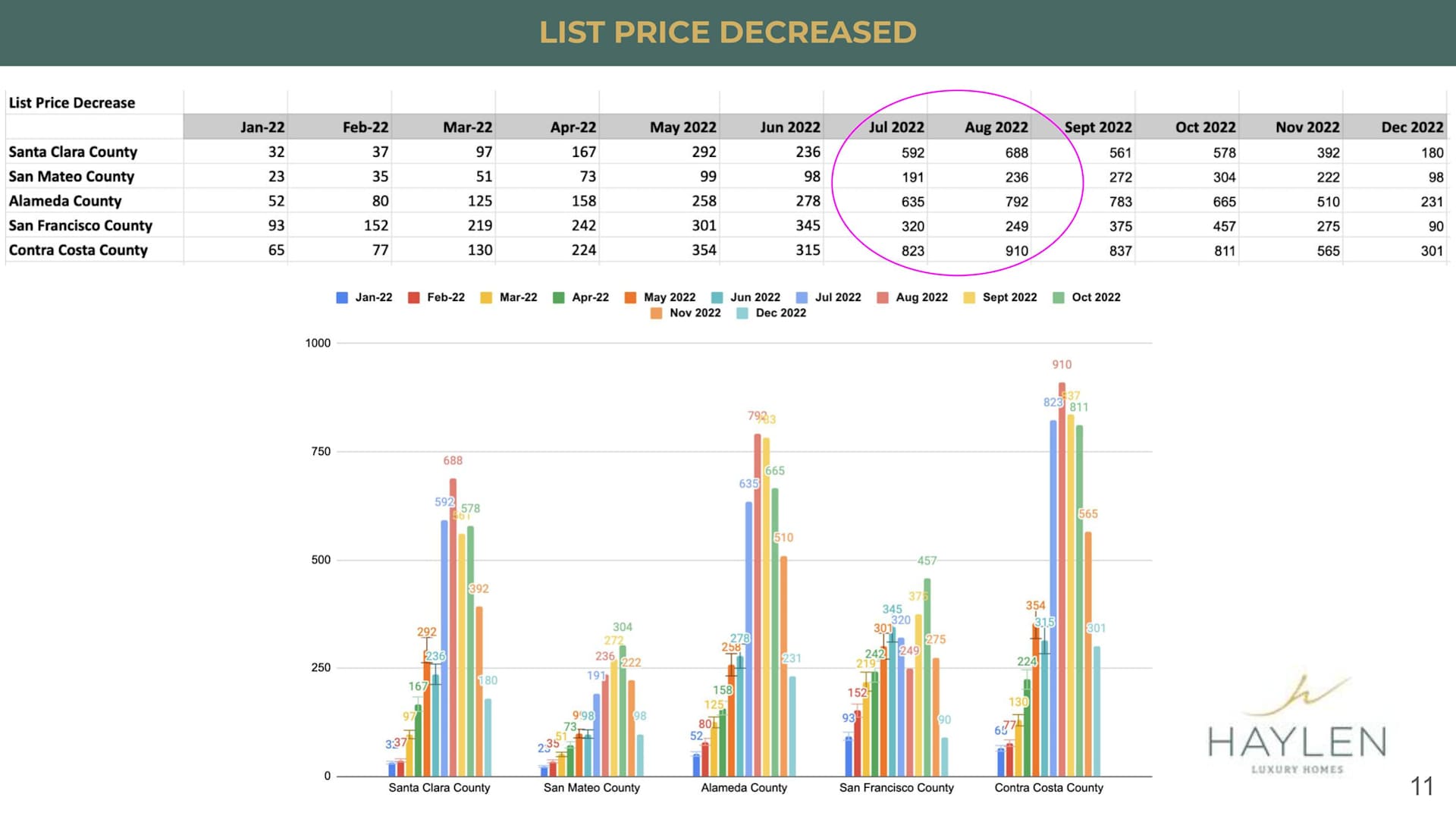 In terms of list price decreased, you see that in July and August of last year, there is a huge jump in how many listings have dropped their prices. This is the time when a lot of sellers realize that the market is changing. Now, we have to start dropping the price, but we started seeing much less sellers are dropping the price. Now, they have a completely different listing strategy, meaning that they might try to list a little bit lower but then a more realistic number instead of before they still trying to fetch for that April and May numbers but they're not able to get it. So, they would lower their asking price. But right now, we start seeing a lot of sellers are much more realistic in terms of their asking price.