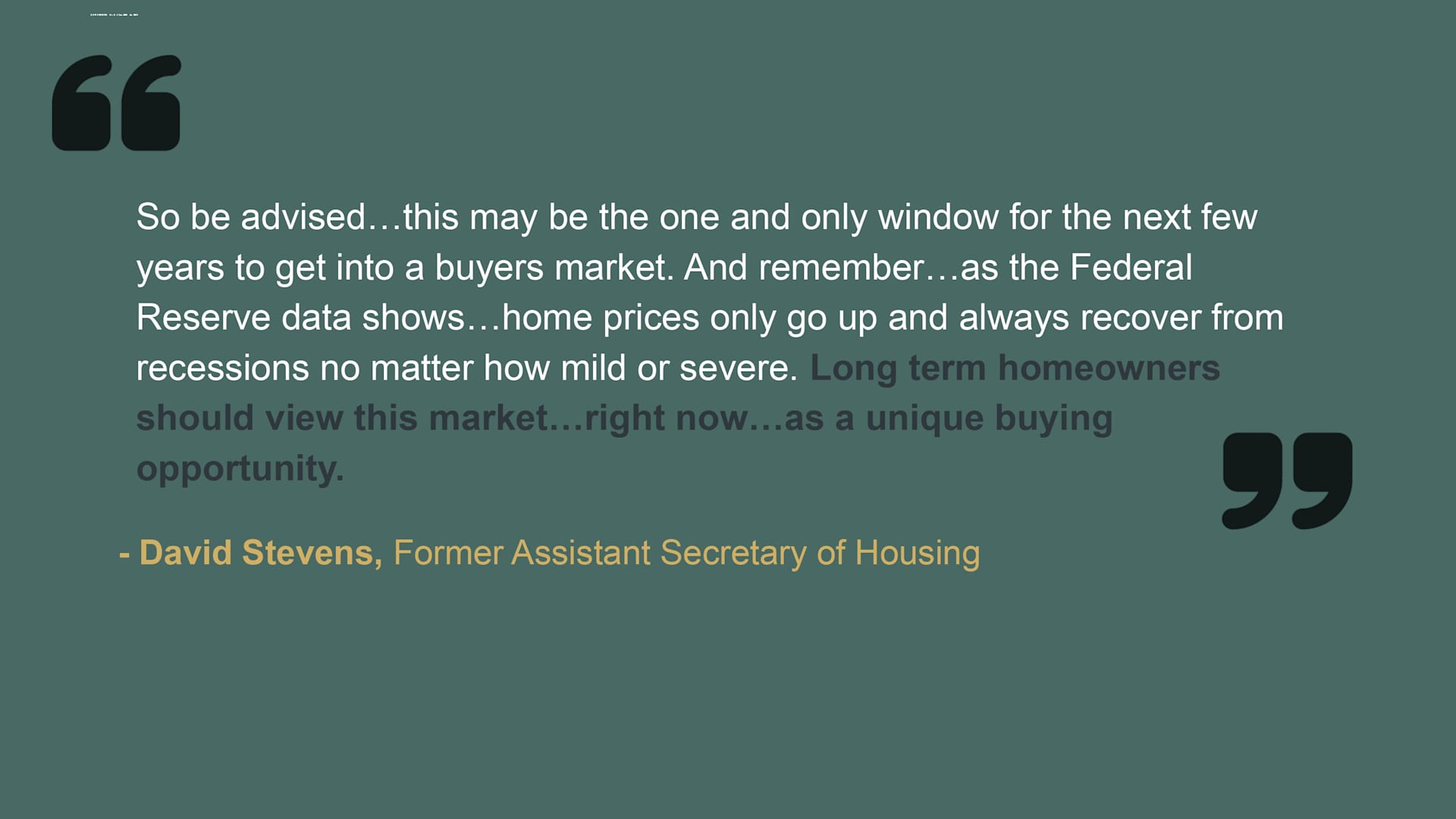 David Stevens who is a Former Assistant Secretary of Housing said, “So be advised… this may be the one and only window for the next few years to get into a buyers market. And remember… as the Federal Reserve data shows… home prices only go up and always recover from recessions no matter how mild or severe. Long-term homeowners should view this market… right now… as a unique buying opportunity.”
