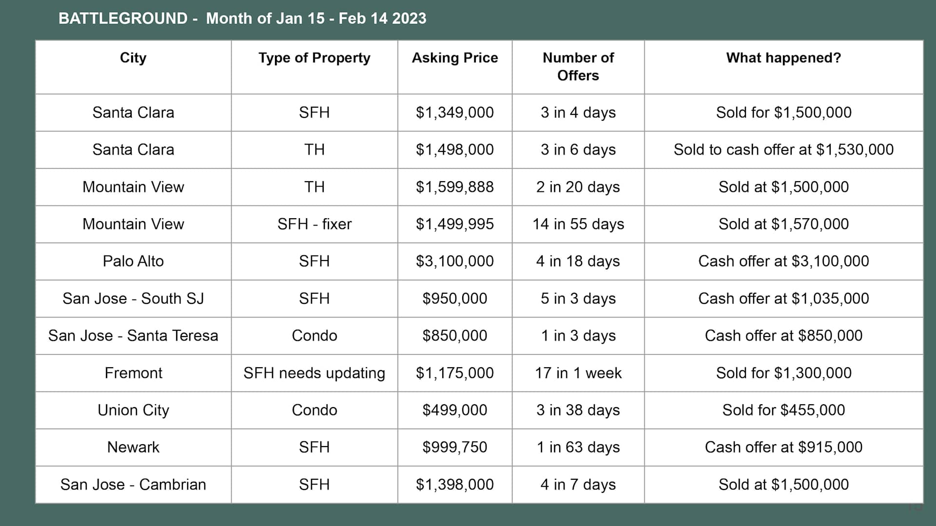 What happens on the Battleground? Obviously, we want to share with you live what's going on with the offers that have been submitted. Here are just some examples for you guys. In the city of Santa Clara, single-family homes asking about 1.349, they received multiple offers. If you look down this column, you see that a lot of multiple offers, and this one was sold for $1.5 million which is not bad at all. It is still pretty high $150,000 over asking price.