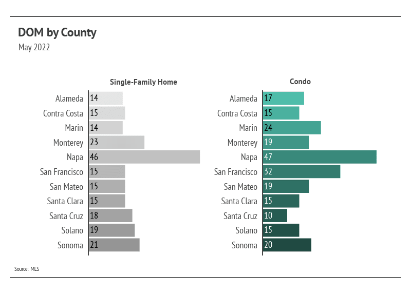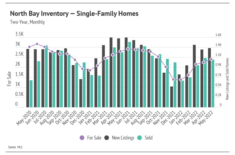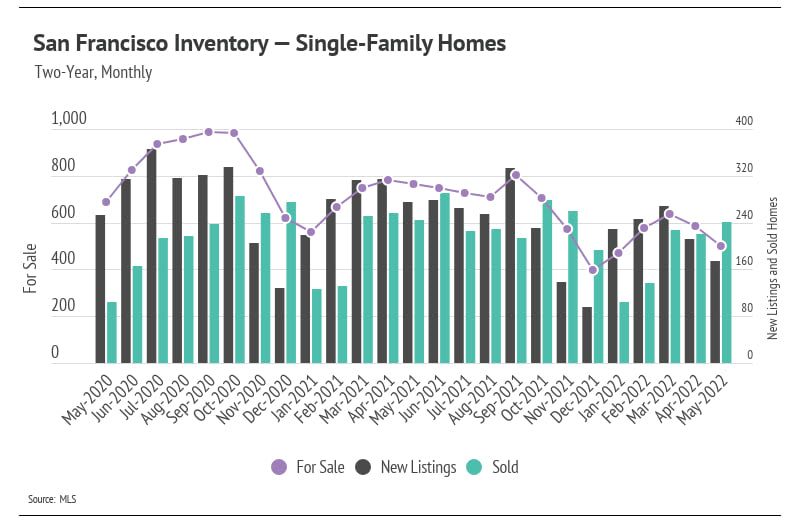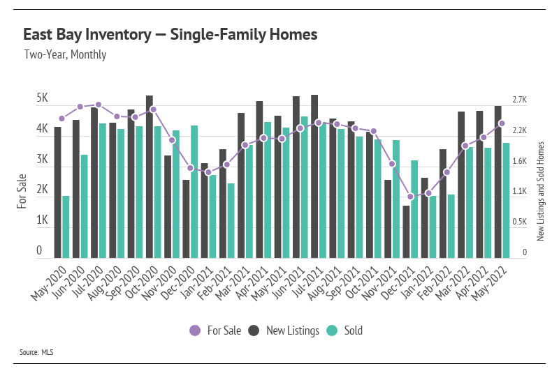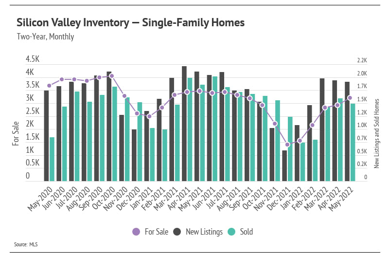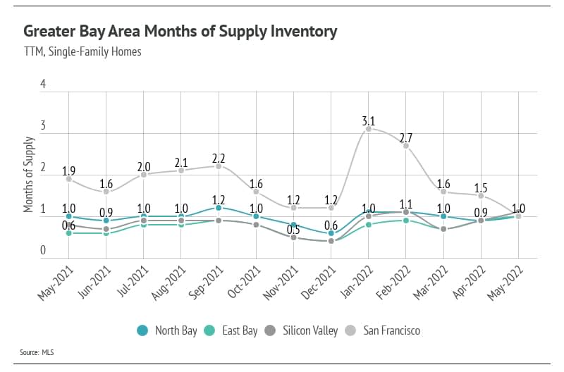 The Greater Bay Area’s housing inventory increased in May with the exception of San Francisco, which serves as an indicator that home supply may follow historically typical seasonal trends, though at a depressed level. The high demand and lack of new listings over the past year brought single-family home and condo supplies to record lows as we entered 2022. Although the first quarter of 2022 had one of the lowest inventories on record, we were pleased to see that inventory increased, a trend that usually holds until mid-summer. With May inventory continuing to rise, but new listings declining, the next two months will likely show us peak inventory levels for 2022.