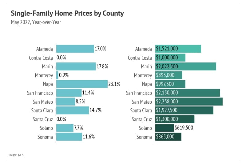 For the most part, median single-family home and condo prices remained historically high in May, slightly below peak. The only exceptions were single-family home prices in the North and East Bay and East Bay condo prices, which all reached all-time highs. It isn’t clear that rising rates have negatively affected home prices so far, and in a rising rate environment, buyers are better off locking in an interest rate sooner rather than later. Since the start of 2022, the average 30-year mortgage rate has increased 2%, which equates to a 27% increase in monthly mortgage payments. Yet prices keep moving higher.