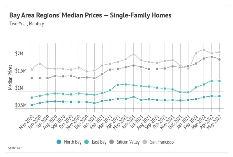 - Home prices in the Greater Bay Area remained historically high in May as more homes entered the market.