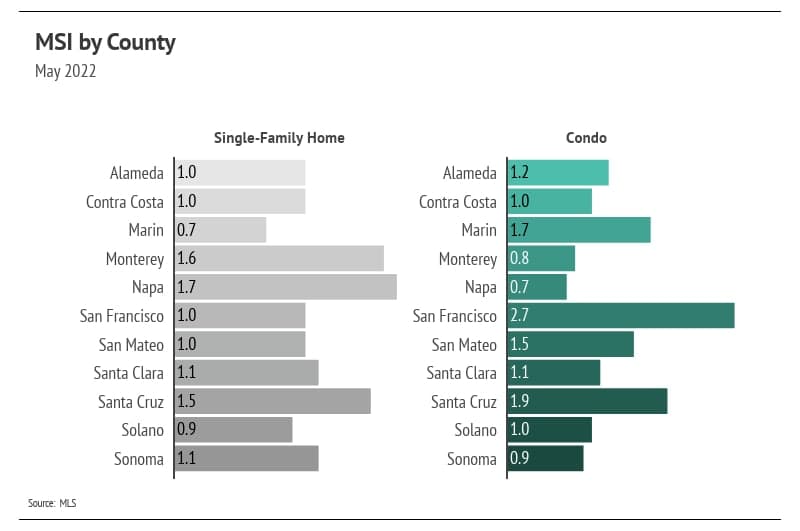Months of Supply Inventory (MSI) quantifies the supply/demand relationship by measuring how many months it would take for all current homes listed on the market to sell at the current rate of sales. The average MSI is three months in California, which indicates a balanced market. An MSI lower than three indicates that there are more buyers than sellers on the market (meaning it’s a sellers’ market), while a higher MSI indicates there are more sellers than buyers (meaning it’s a buyers’ market). Currently, single-family home and condo MSIs are exceptionally low, indicating a strong sellers’ market.