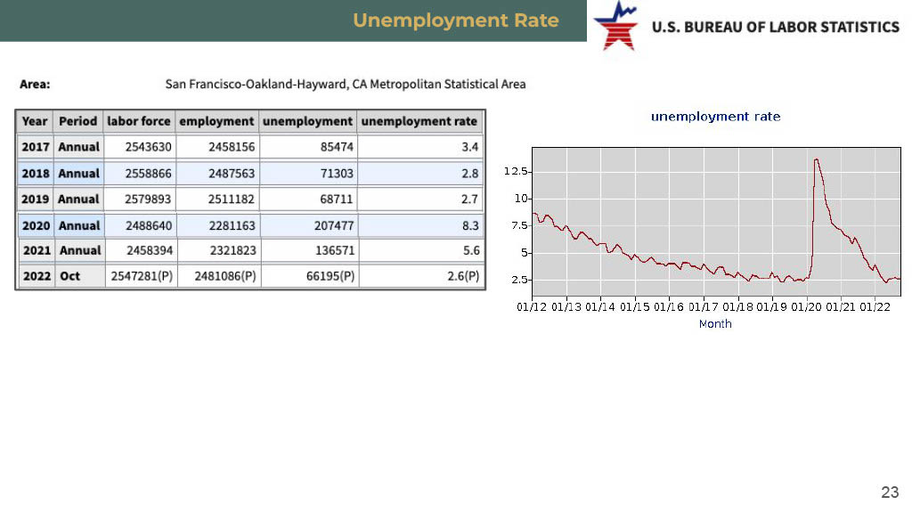 In terms of San Francisco, Redwood City, so more to the peninsula area, in 2017, the unemployment rate is at 2.9%; in 2018 at 2.3%; in 2019 at 2.2%; and then 2020, at 7.6%; in 2021 at 4.8% and then in 2022, it came back down to 2.1. The same thing, they have quite a bit more people in the labor force, but at the same time, the unemployment number of people has come down quite a bit from 28,786 to 21,406 people.