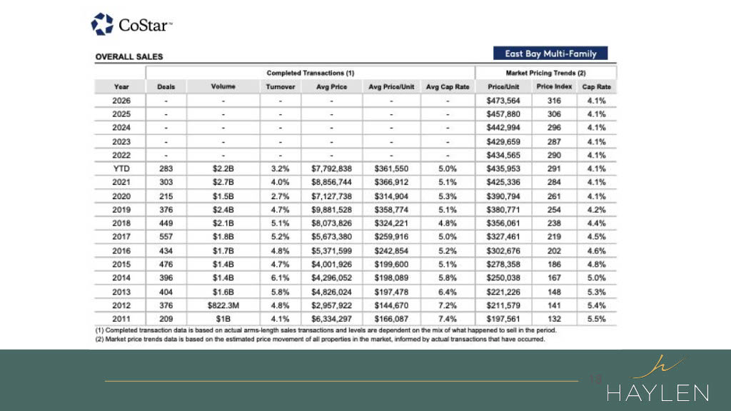 For East Bay Multi-Family, the average cap rate is about 5% which is a little higher and it's very common to see that East Bay cap rate is a little bit higher than San Francisco and also San Jose but then they are expecting the cap rate is going to stay at around 4.1% or so.