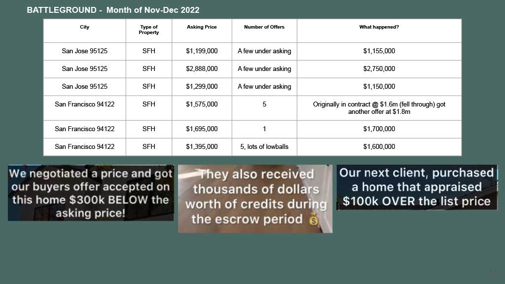 These are some of the Battlegrounds we have for November and December. Definitely slower months but we had a few under the asking price, a few people are offering but they're all under the asking price. For example, in the San Jose, Willow Glen area, it ranges from $1.2 million to almost $3 million, but they all pretty much came in under the asking price.
