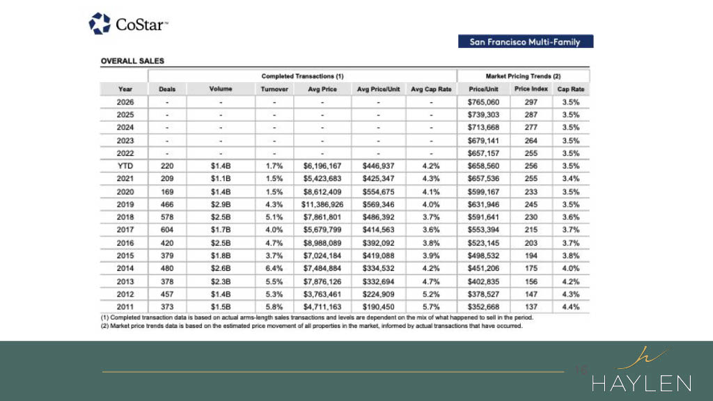 Let's take a look at this report from CoStar. This is for San Francisco multi-family side and as you see, the year-to-date cap rate is still at 3.5%. If you understand cap rate and interest rate, you get a cap rate at 3.5% and while your mortgage rate is at 6%, you're not going to cash flow and even if you put 50% down payment, you still can't get a cash flow on these properties and it's just amazing to know that they are still getting 3.5% cap during this kind of slow market.