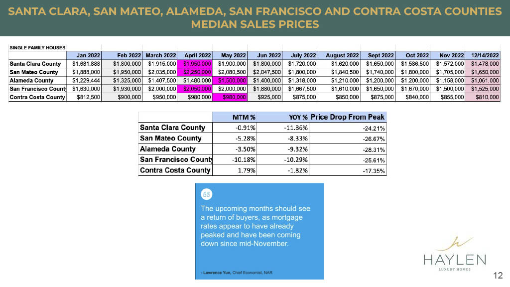 As for San Mateo County, peaked in April at $2.25 million and as of November full month is $1.705 but as of today is at $1.65 million in terms of the median sales price.