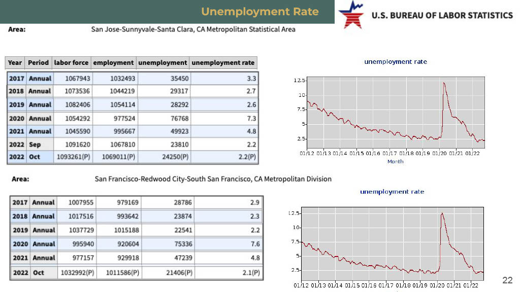 In the San Jose, South Bay Area, let us look back in 2017, the unemployment rate is at 3.3%; 2018, 2.7%; in 2019, 2.6% and of course, in 2020, went up to 7.3%, came back down to 4.8% and as of October 2022, is at about 2.2%.