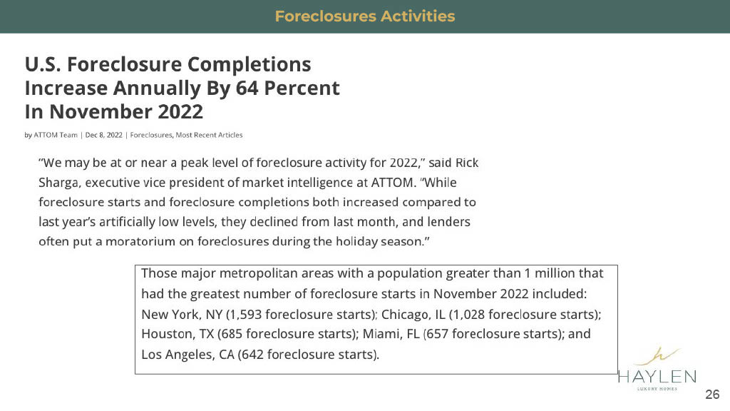 Here is some news article from ATTOM team and U.S. foreclosure completions increased annually by 64 in November 2022. Again, I just want to show we do see a lot of these articles right now talking about how foreclosure activity is peaking. While foreclosure starts and foreclosure completions both increase compared to last year's artificially low levels, they declined from last month, and lenders often put a moratorium on foreclosure during the holiday season.