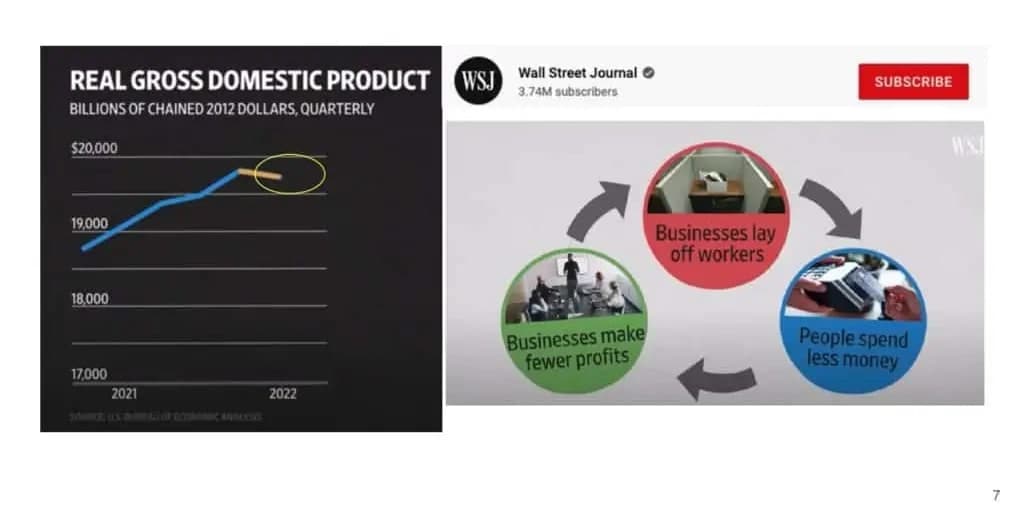 One thing that we mentioned is the GDP. The way we consider there’s a recession is that we see there are two consecutive quarters of slowing down on the GDP which we do have right now. So, we are kind of considering that this is the beginning of the recession as one of the factors. The other one is that if the GDP comes down, then it can affect a lot of businesses and one of the three things that this video has talked about is that the businesses can lay off workers and also people spend less money and if people spend less money than these companies will make fewer profits and so this is like a cycle and then, of course, again the business will lay off workers.